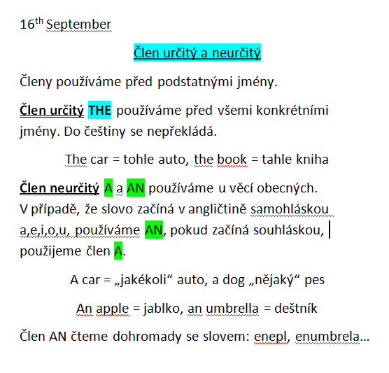 AJ - pětiminutovka, opakování členů neurčitých A/AN, uč. str.6/cv.2 (několikrát dokola)