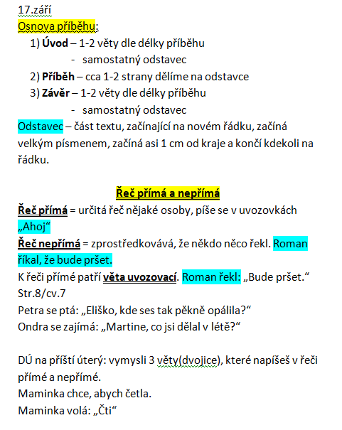 ČJ -sloh: opakování vyprávění, poznávání odstavců, řeč přímá a nepřímá