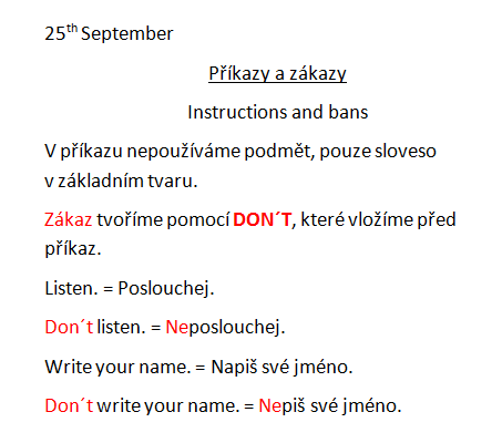 AJ - kontrola slovníčků, procvičování příkazů a zákazů z uč. str.7, zápis do sešitu, prac. sešit str.5/cv.5 (poslech)