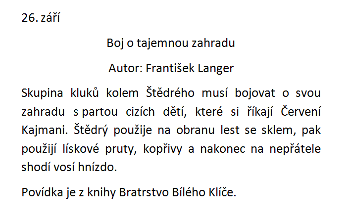 ČJ čtení - úvodní stránka o povinné četbě do sešitu (viz. stránka povinná četba) a na druhou stranu popis, jak vypadá referát na knihu (též viz. stránka povinná četba)